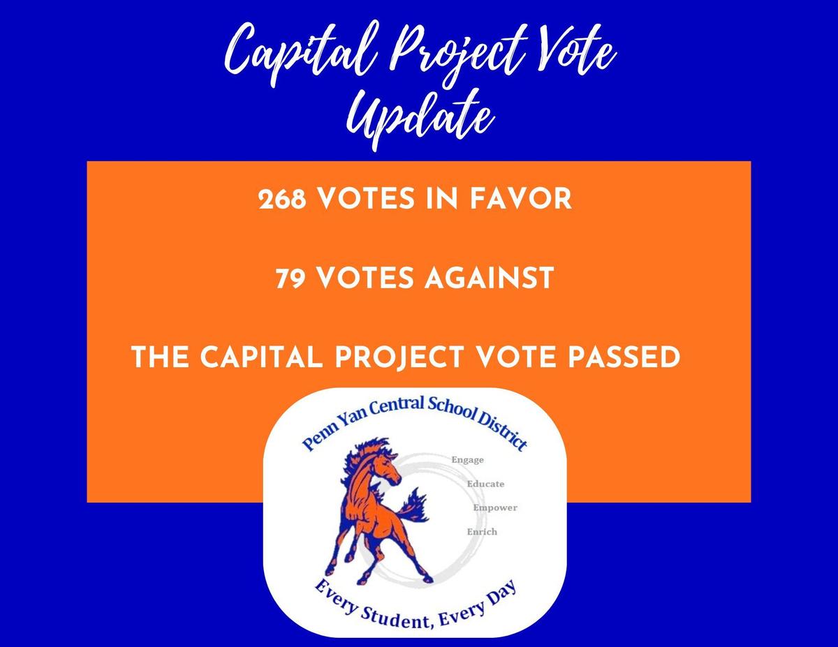 The proposed Capital Improvement Project was approved by the community. I would like to take a moment to thank all those within our community who provided feedback, took time to ask questions, and who participated in the vote. The Penn Yan CSD appreciates the support and partnership of the Mustang Community! The results of the vote were: